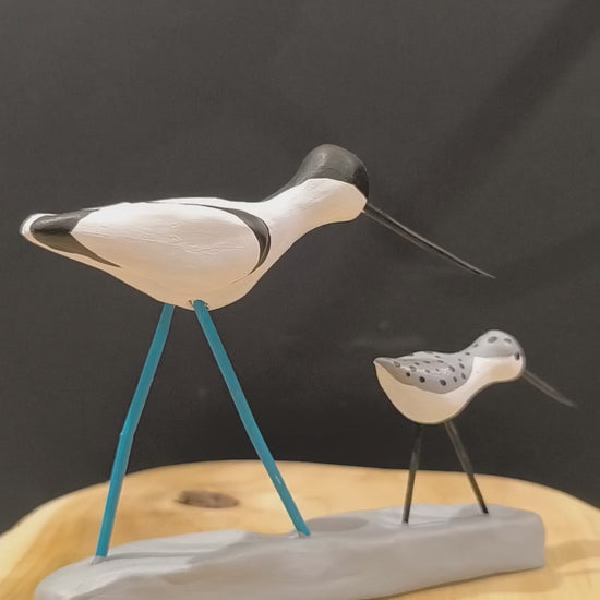 Elegant avocet figurine and its young, for interior decoration or display case.