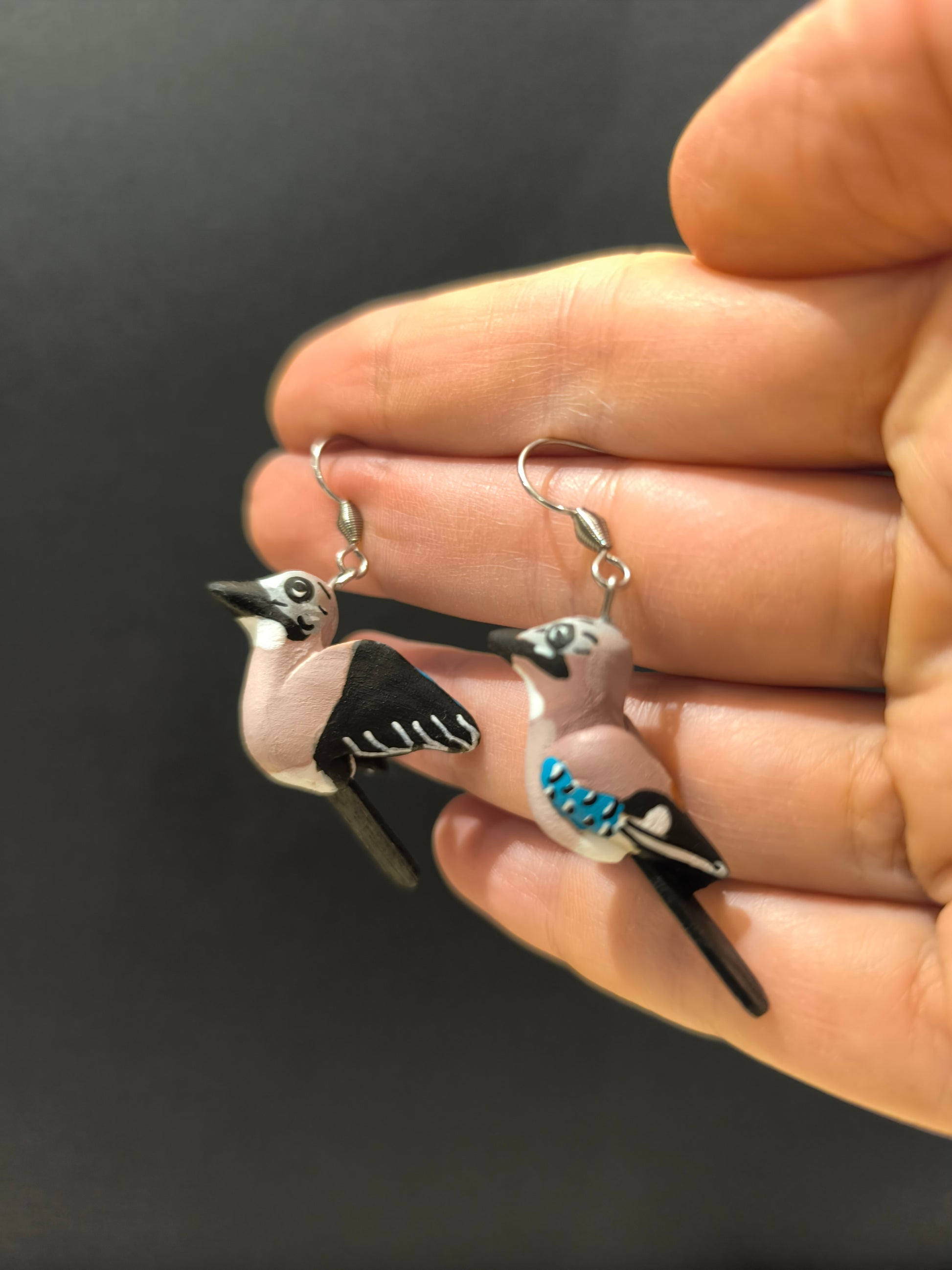 Boucles d'oreilles oiseaux Geai des chenes modelées et peintes à la main....Pour mettre une touche de nature et de poésie à vos oreilles!