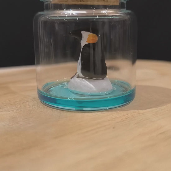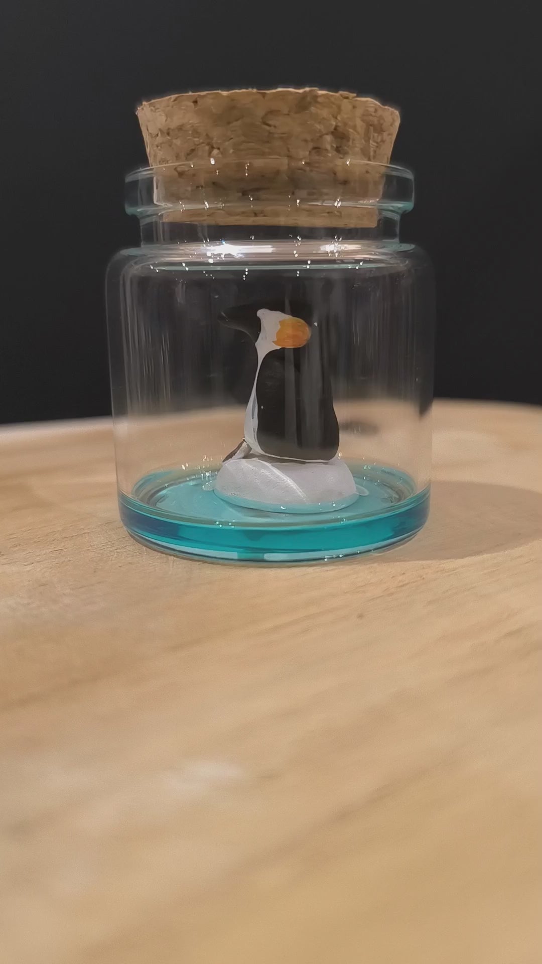 Manchot empereur miniature dans petit flacon avec micro décor naturel.