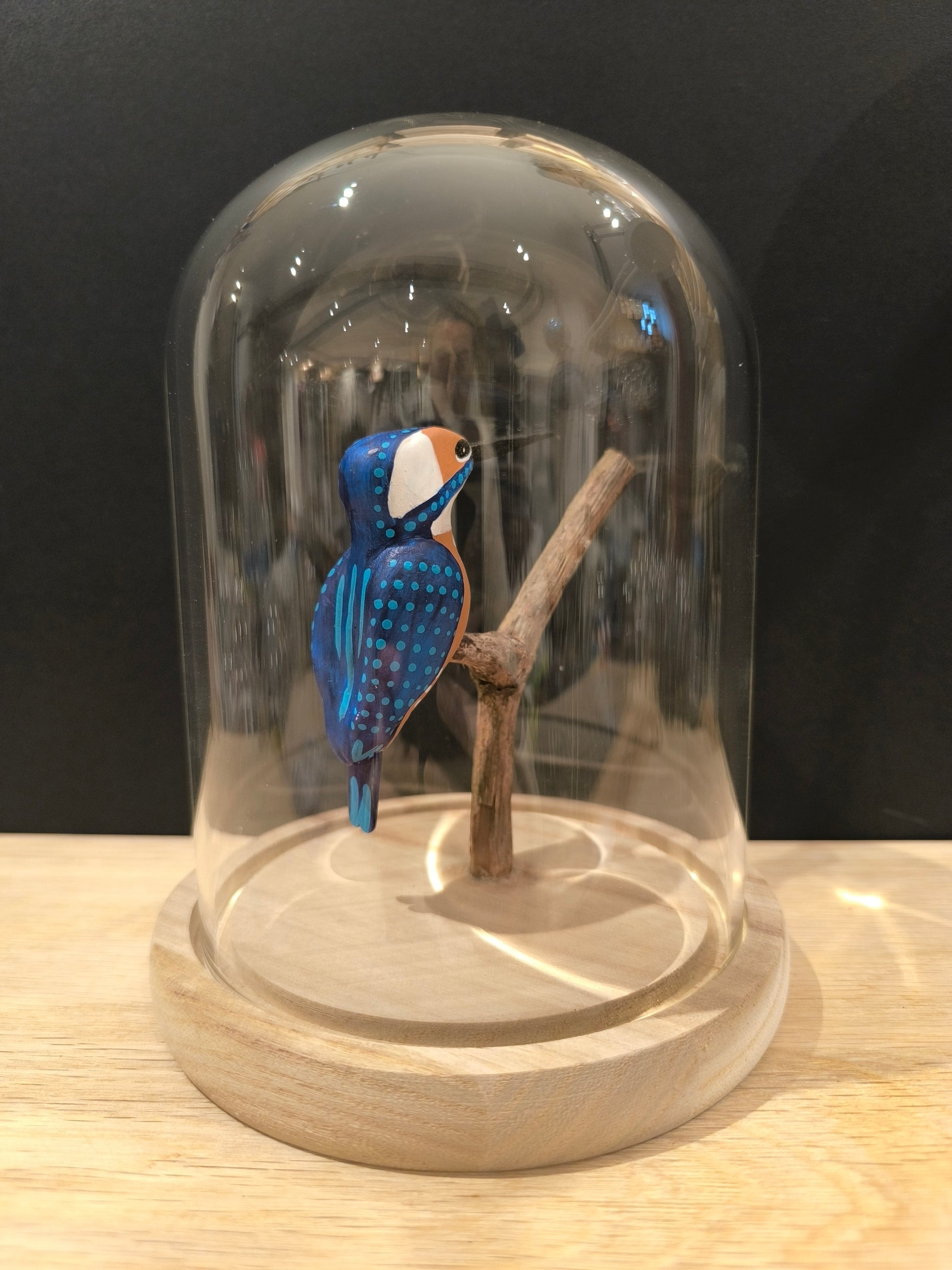 Kingfisher figurine under glass bell, for interior decoration or display case.