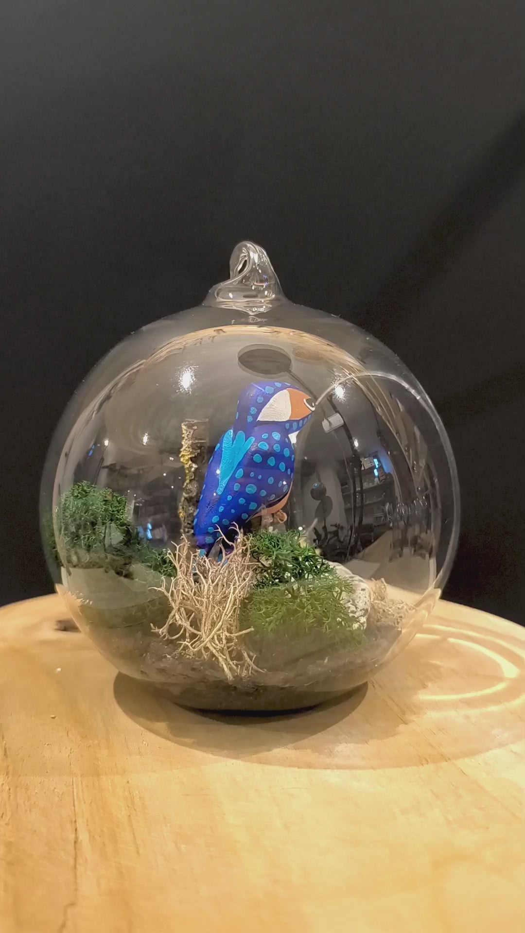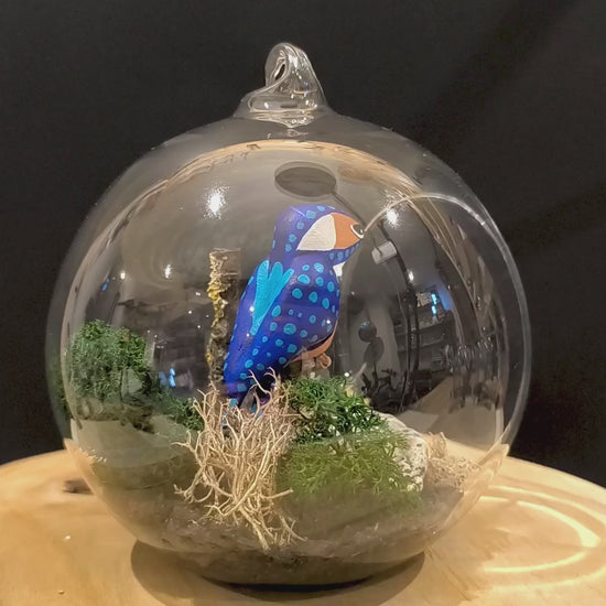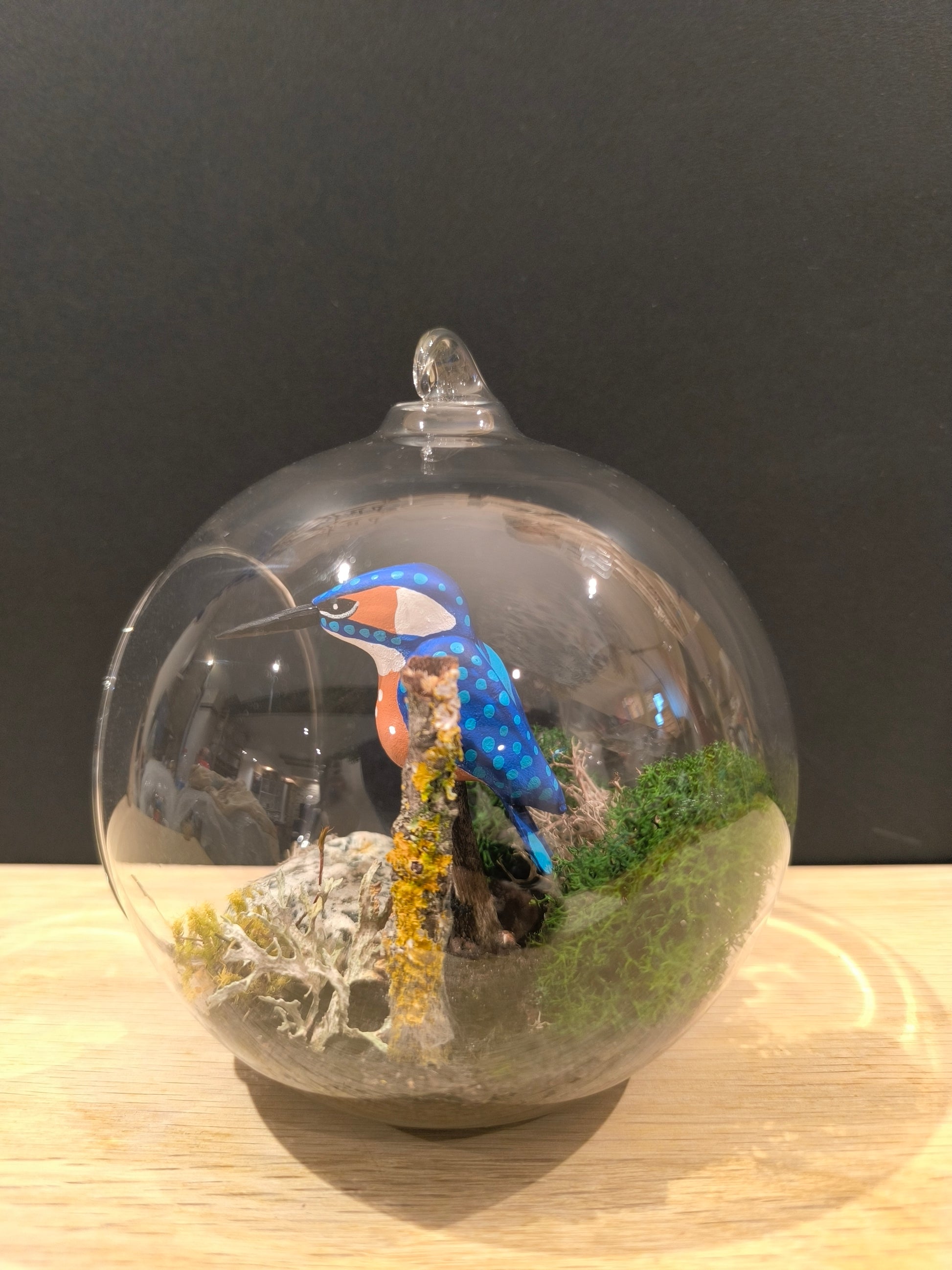 Martin pêcheur dans bulle de verre avec décor naturel.