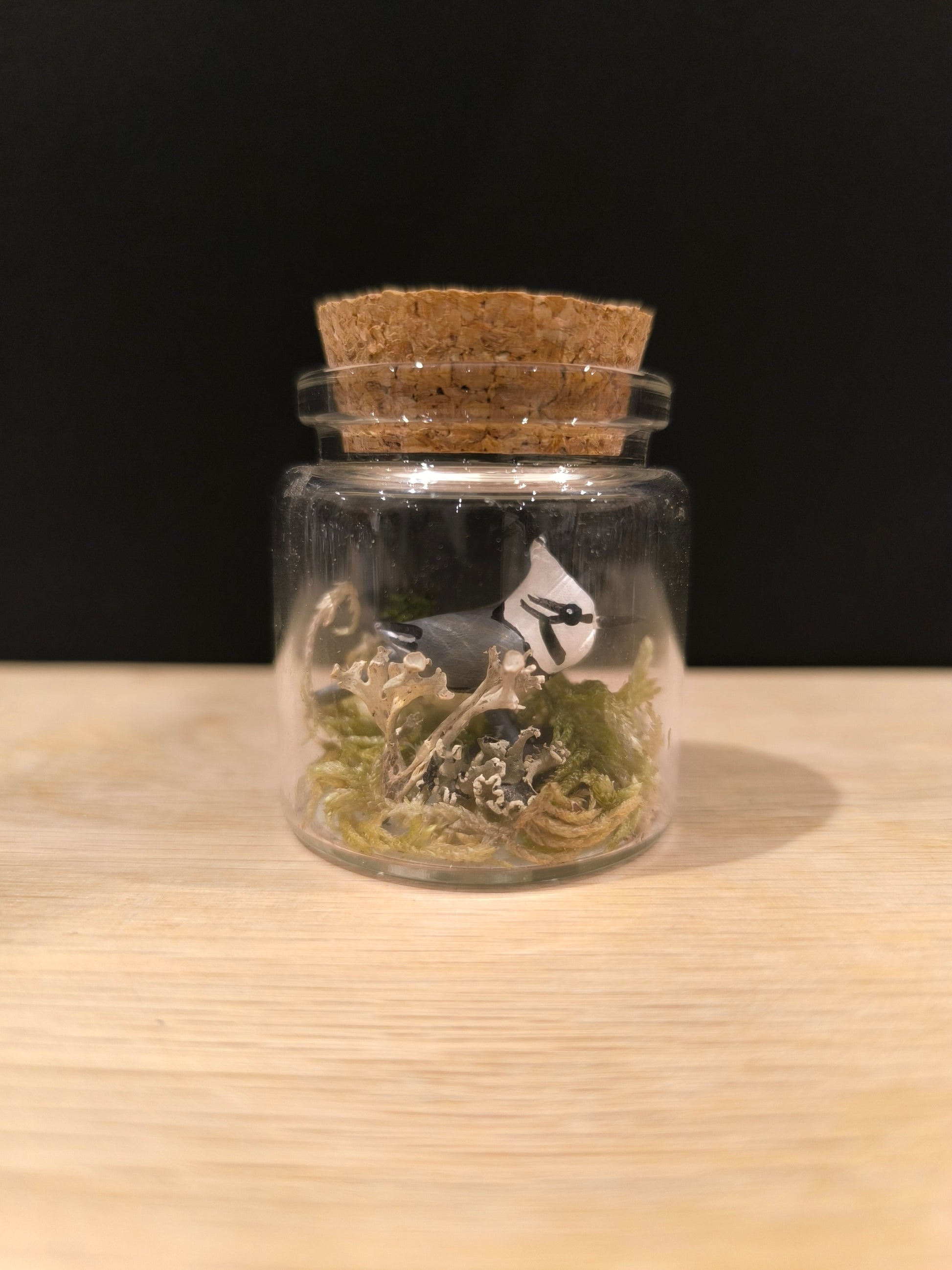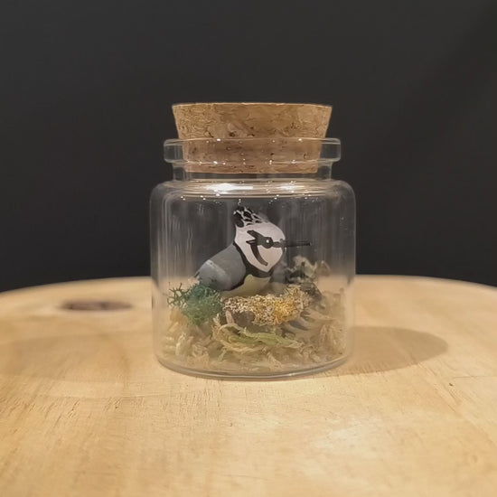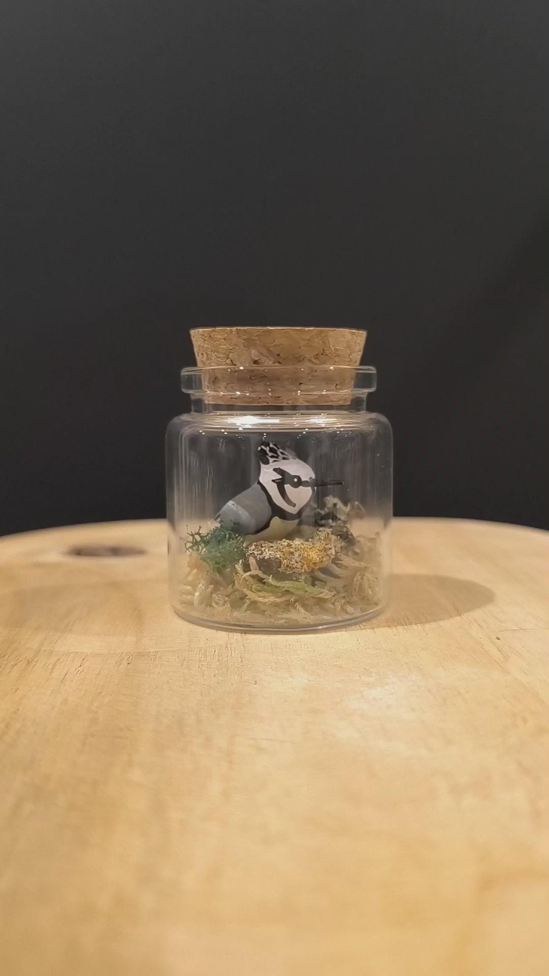Mésange huppée miniature dans petit flacon avec micro décor naturel.