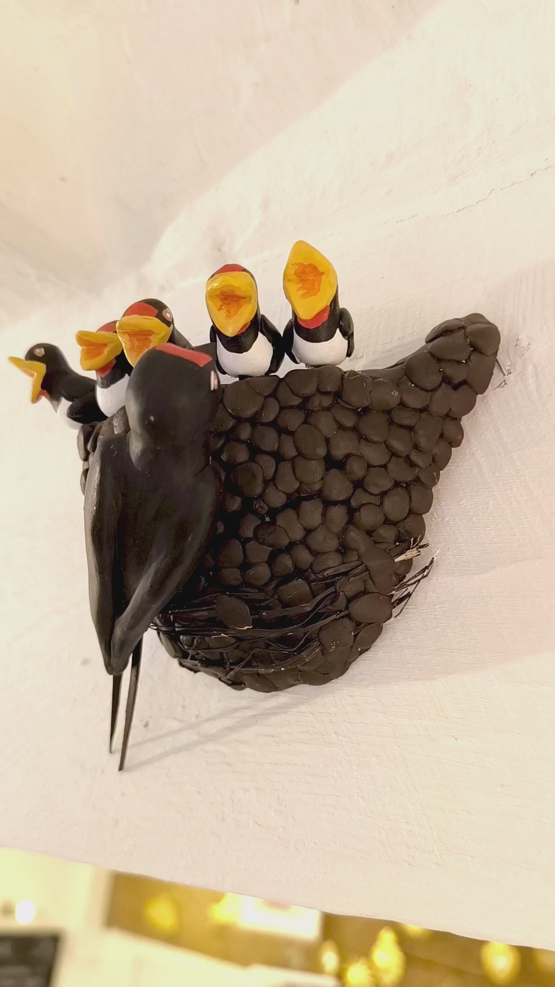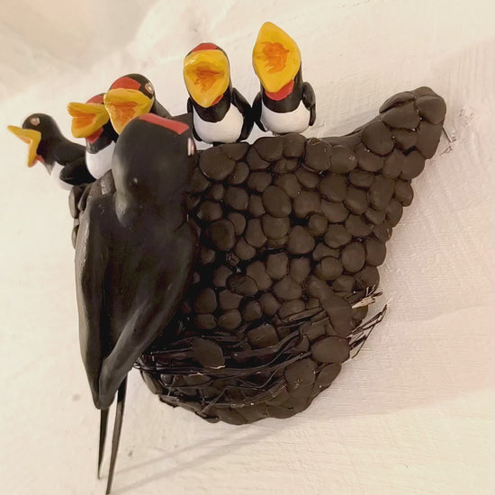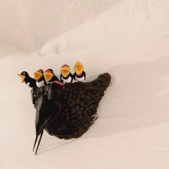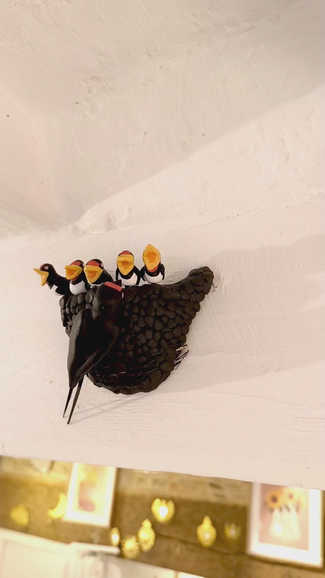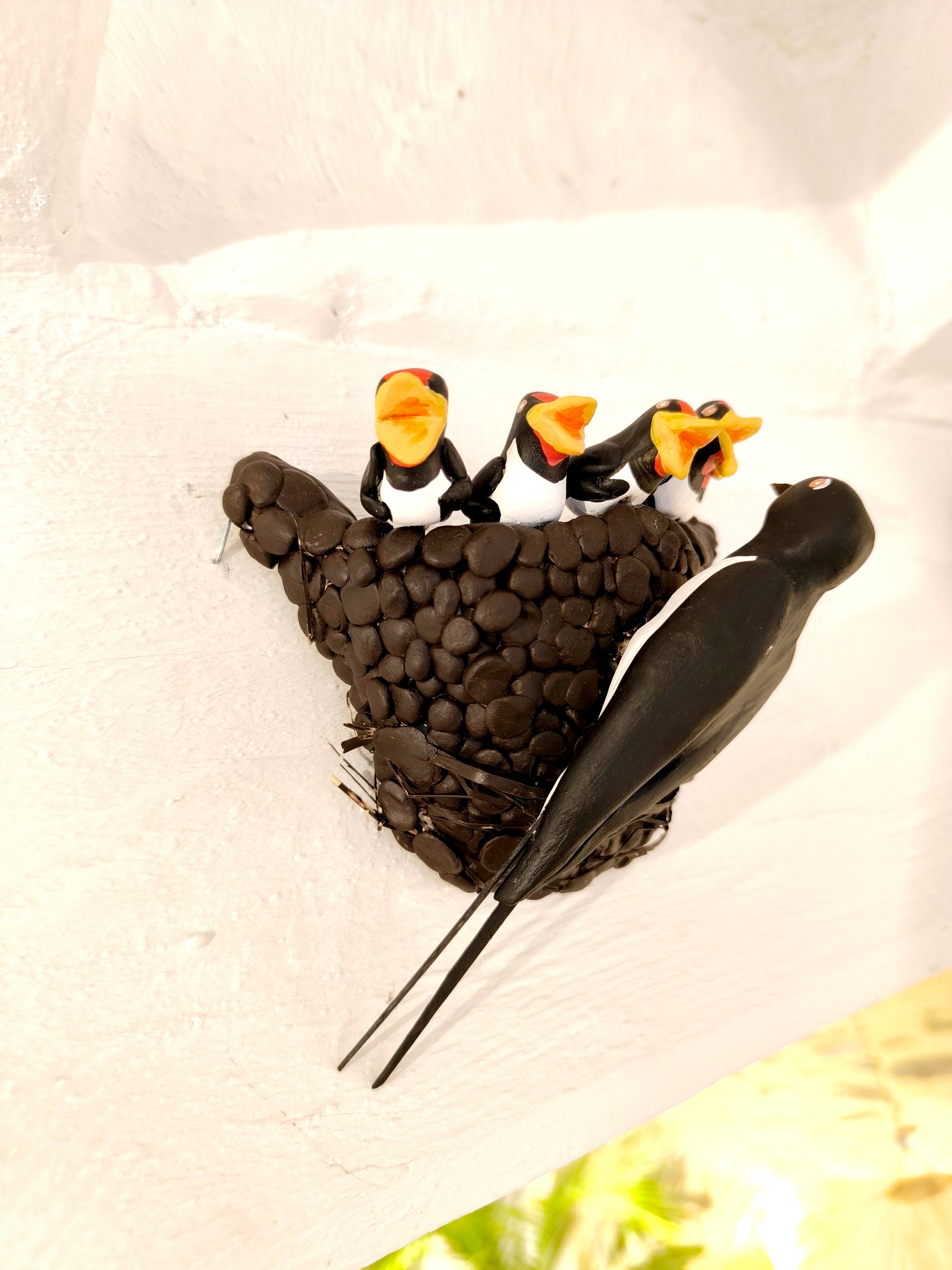 Nid d'Hirondelle rustique avec ses 5 petits. Deux crochets de fixation son posées à l'arrière pour une fixation discrète et réaliste. À installer en intérieur sur une poutre, en haut d'un mur...