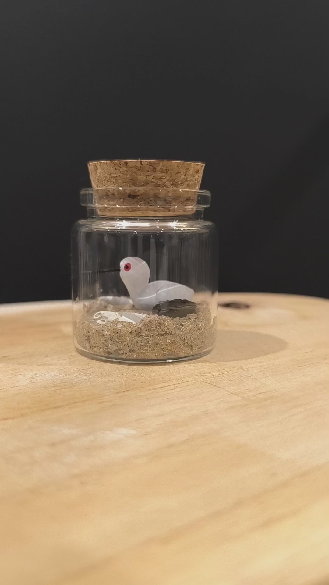 Spatule blanche miniature dans petit flacon avec micro décor naturel.