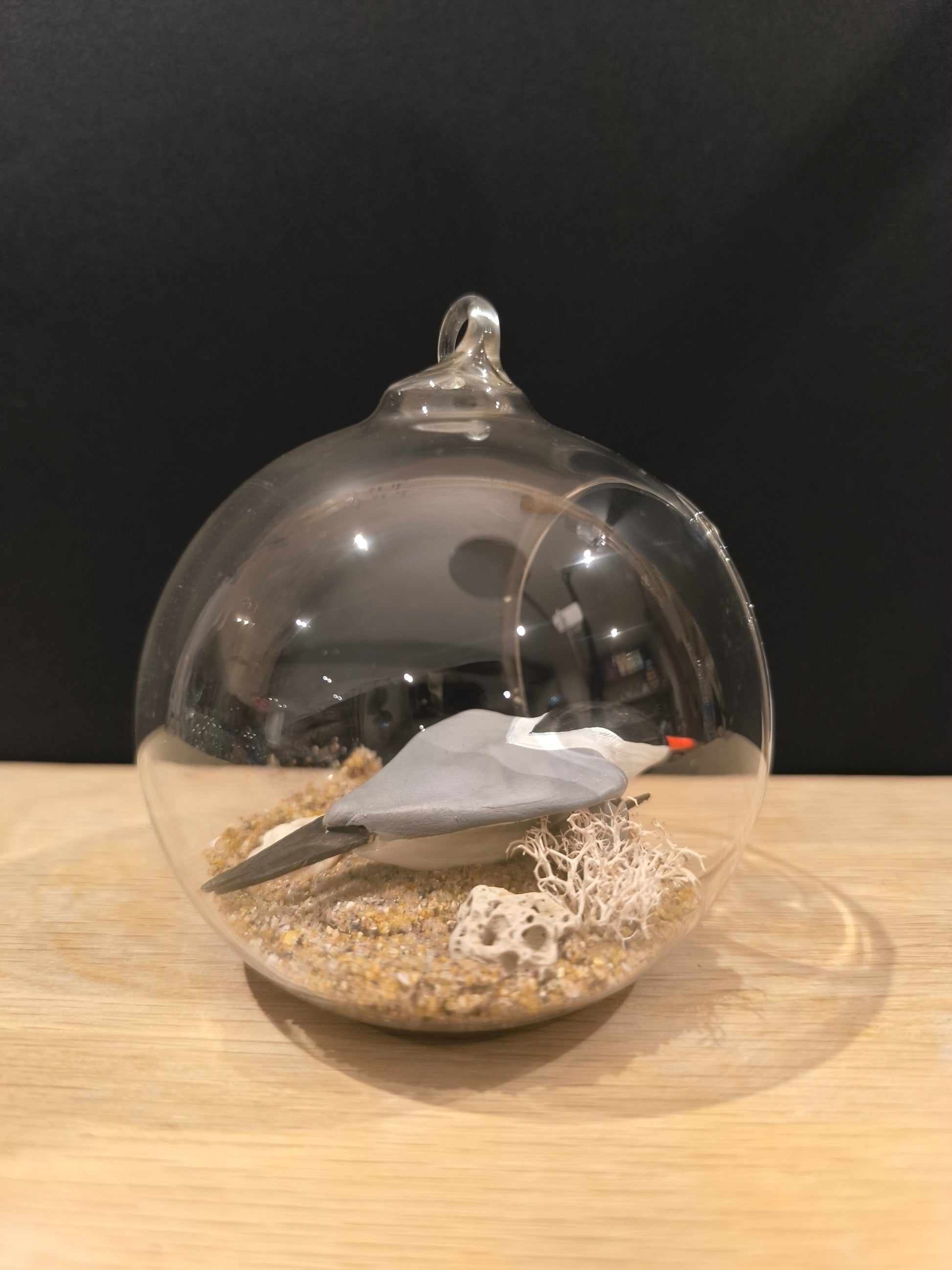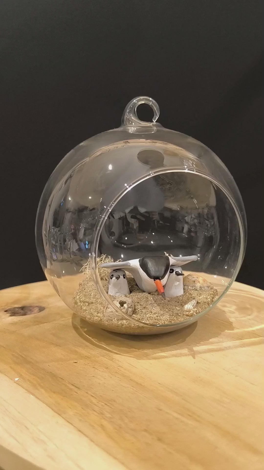 Bulle de verre avec Sterne pierregarin miniature et ses petits dans petit décor naturel.