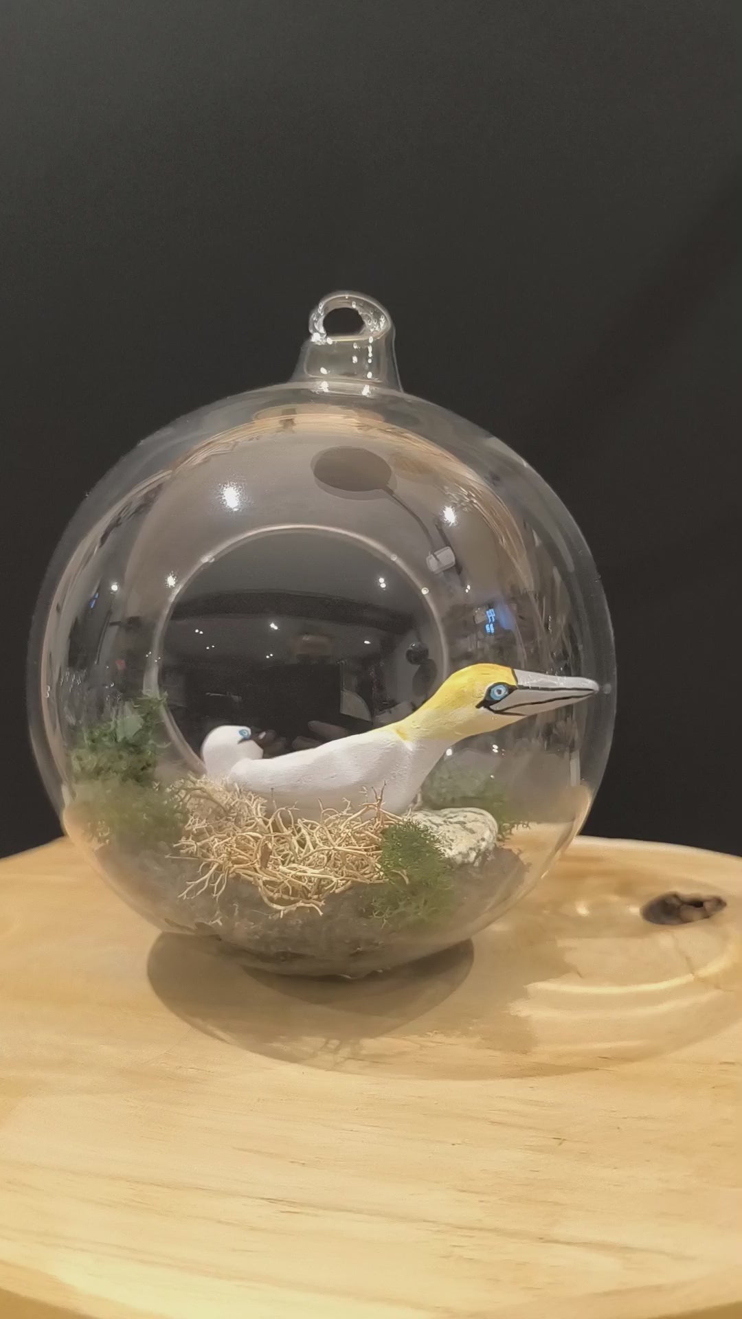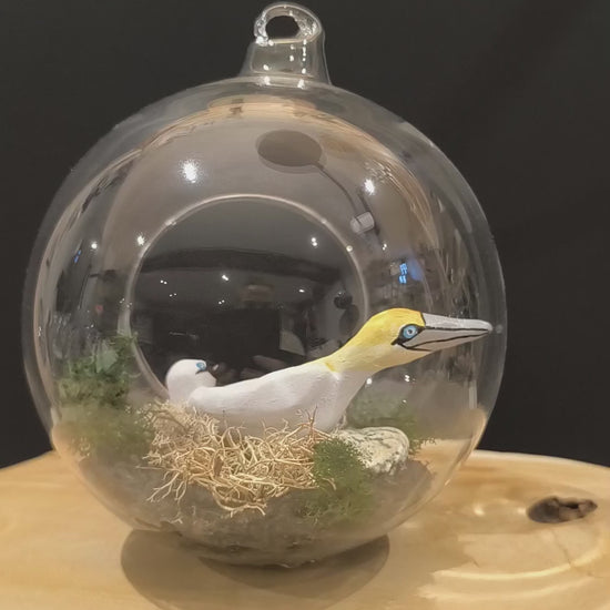 Fou de bassan avec son petit dans bulle de verre avec décor naturel.