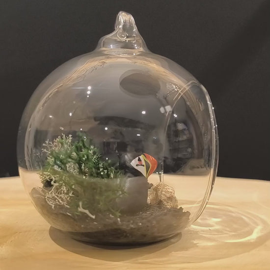 Bulle de verre avec Macareux miniature avec son petit dans petit décor naturel.