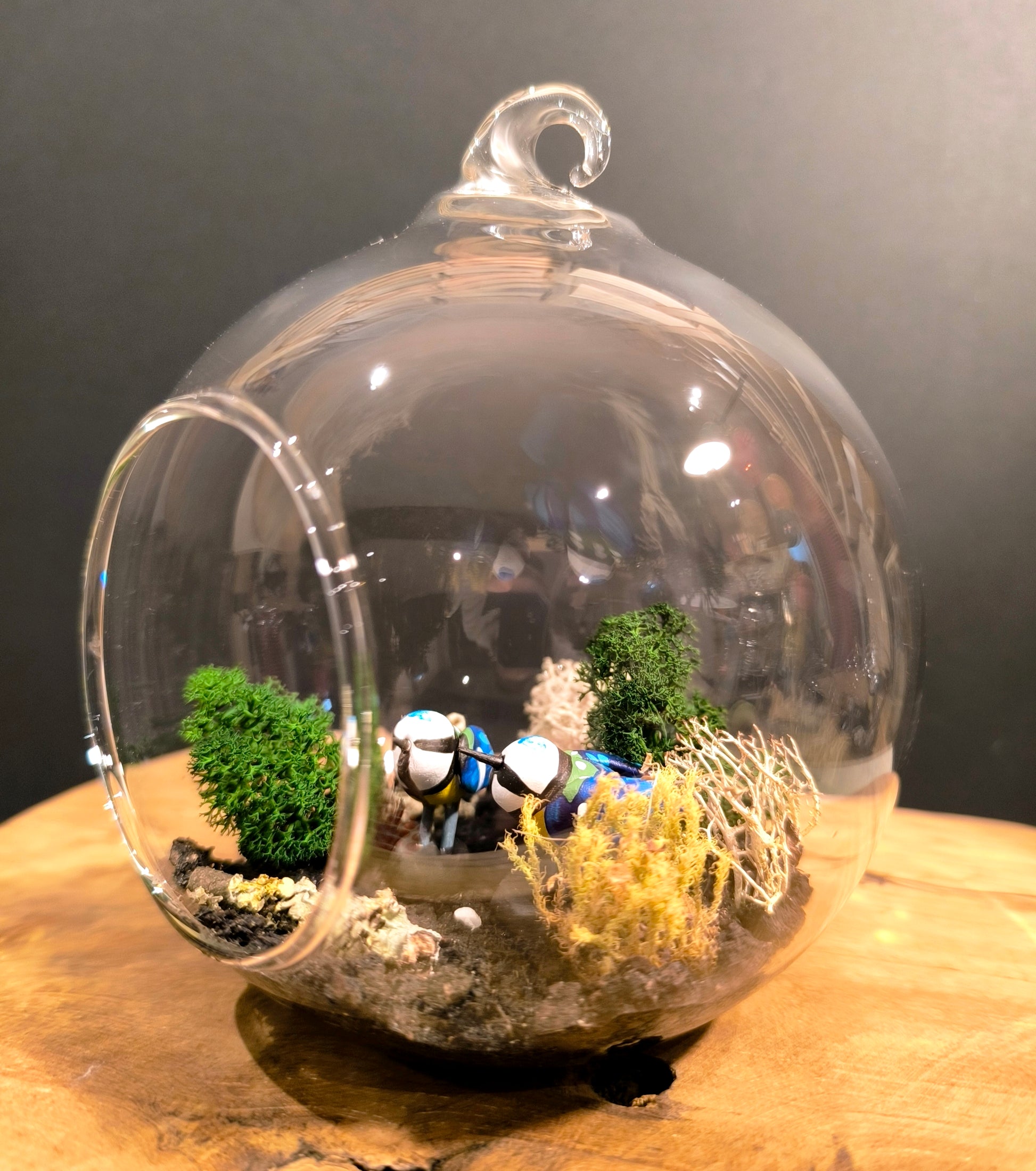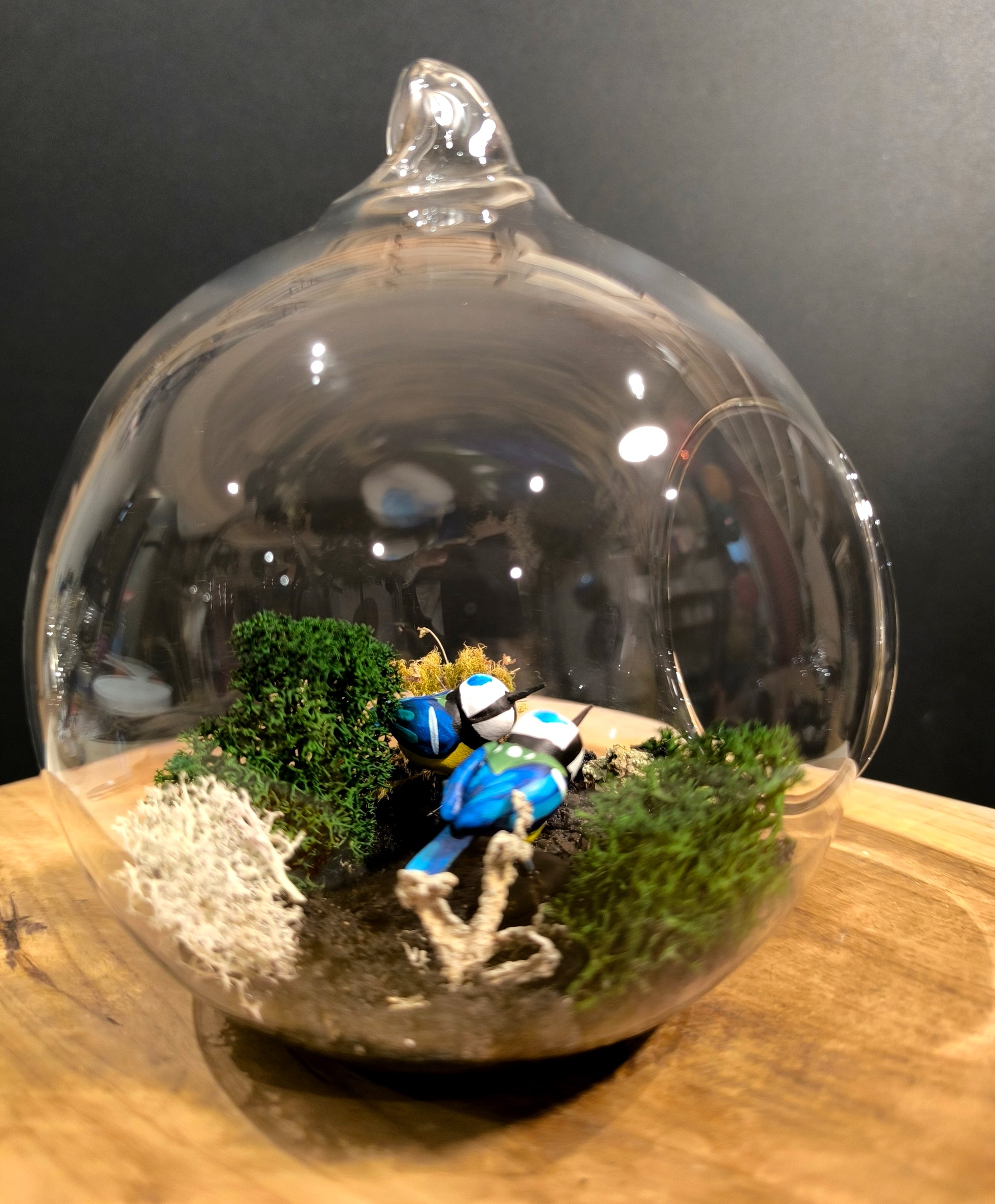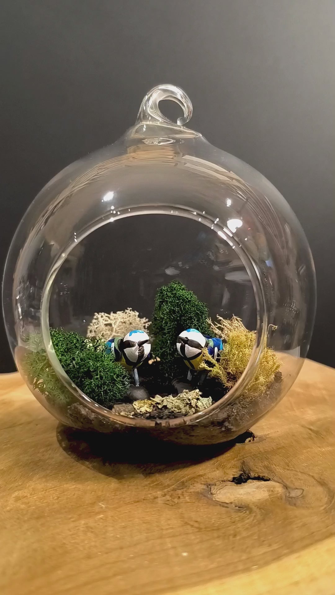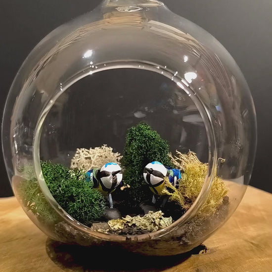 Grande bulle de Rêve avec petit couple de Mésanges bleues. Bulle en verre. Argile modelée et peinte à la main.