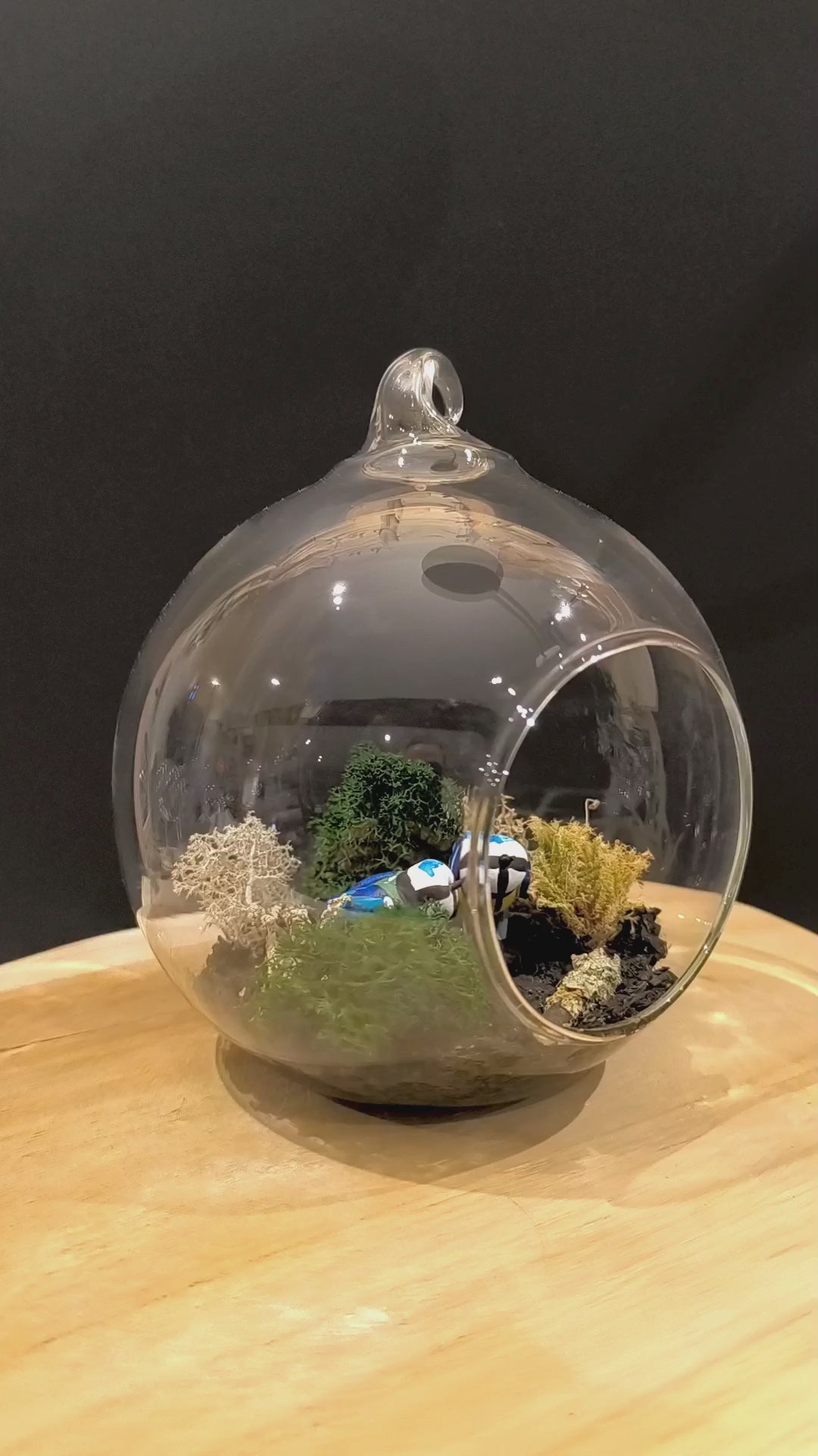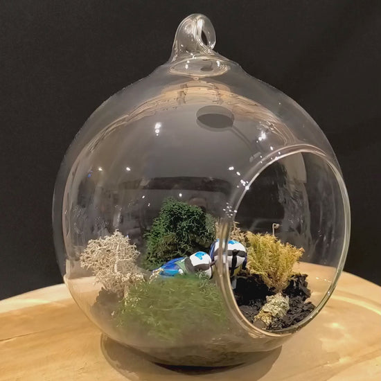 Couple de Mésanges bleues dans bulle de verre avec décor naturel.