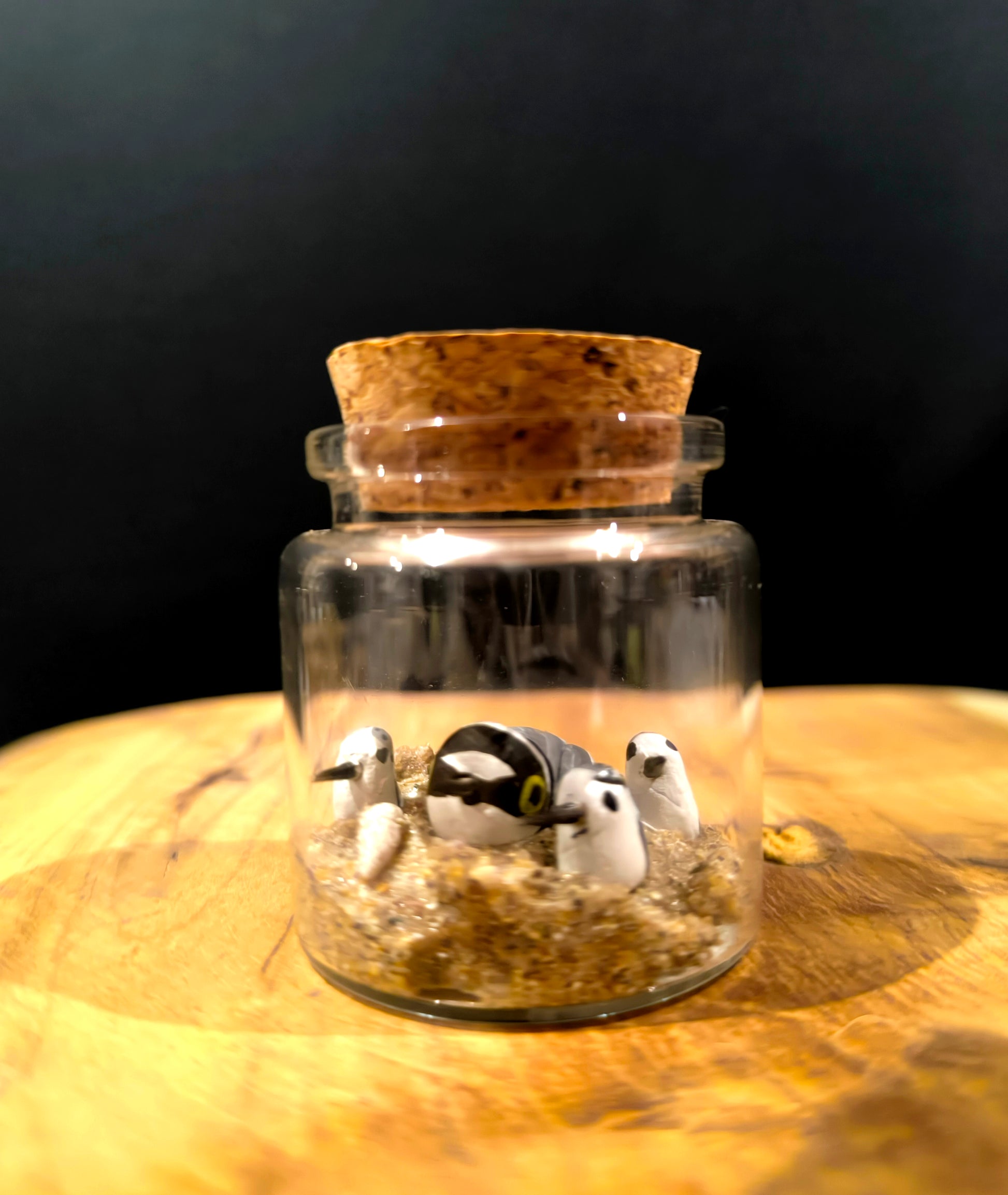 Petit gravelot miniature et ses petits dans petit flacon avec micro décor naturel.