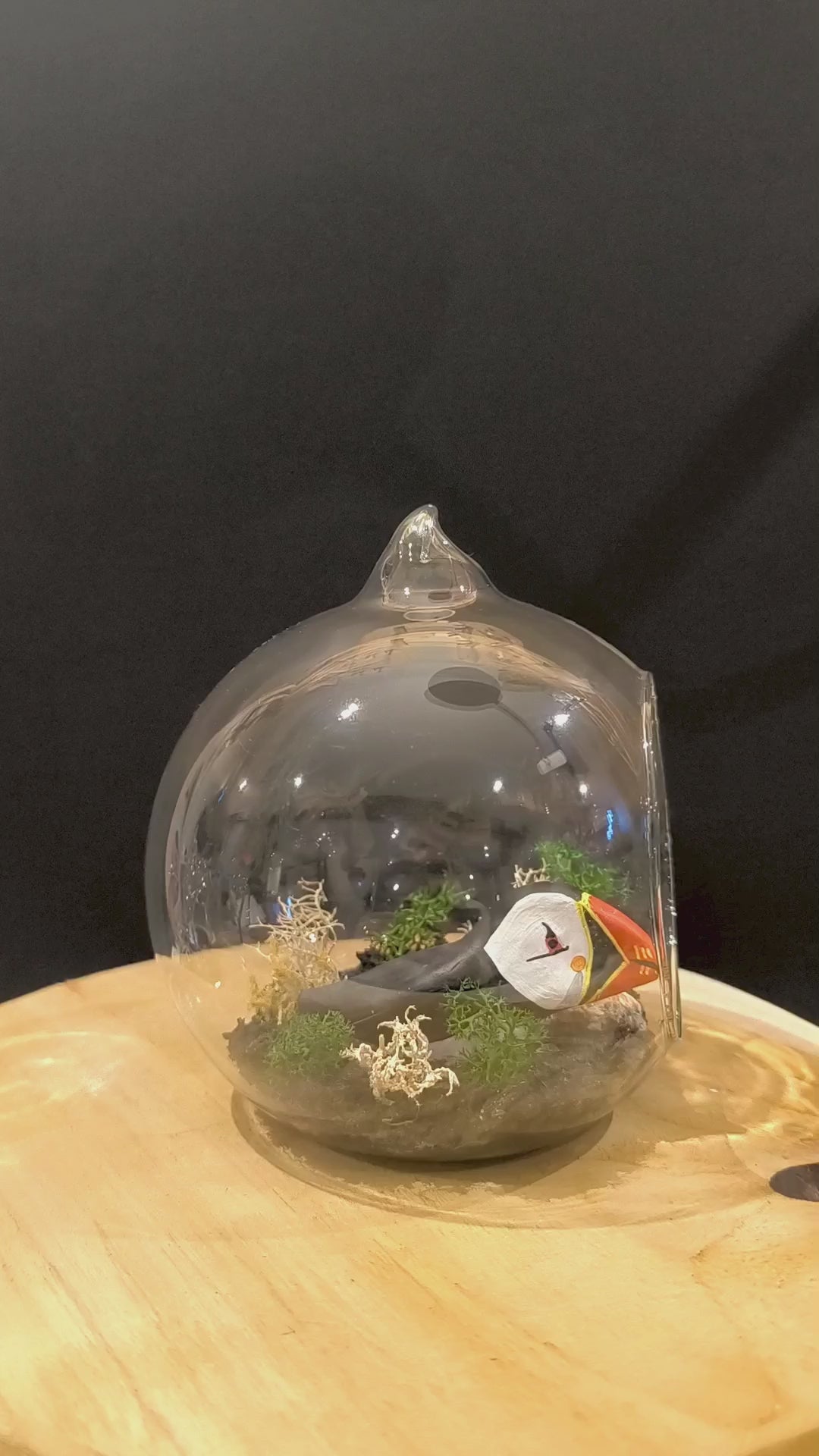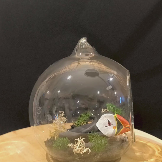 Macareux miniature et son petit dans bulle de verre avec petit décor naturel.